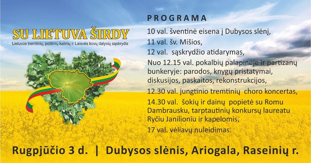 Kaip ir kasmet, pirmąjį rugpjūčio šeštadienį Ariogaloje, Dubysos slėnyje, vyks Lietuvos tremtinių, politinių kalinių ir Laisvės kovų dalyvių sąskrydis „Su Lietuva širdy“. Į jį kviečiami ne tik vargus Sibire patyrusieji, bet ir visi Lietuvą mylintys žmonės. Norinčius vykti į šią šventę prašome rinktis rugpjūčio 3 d. 7 val. prie Skuodo rajono kultūros centro. Iš anksto kviečiame užsiregistruoti tel. 8 600 12 479.