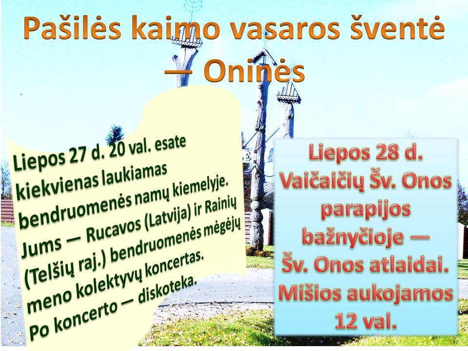 Oninių šventė Pašilėje 2019-07-22 | (0) Liepos 27 d. 20 val. Pašilės bendruomenės namų kiemelyje vyks vasaros Oninių šventė. Joje koncertuos Rucavos kultūros namų (Latvija) ir Rainių (Telšių r.) bendruomenės mėgėjų meno kolektyvai. Po koncerto – diskoteka. Prenumeruokite „Mūsų žodį“ 2026-iems metams