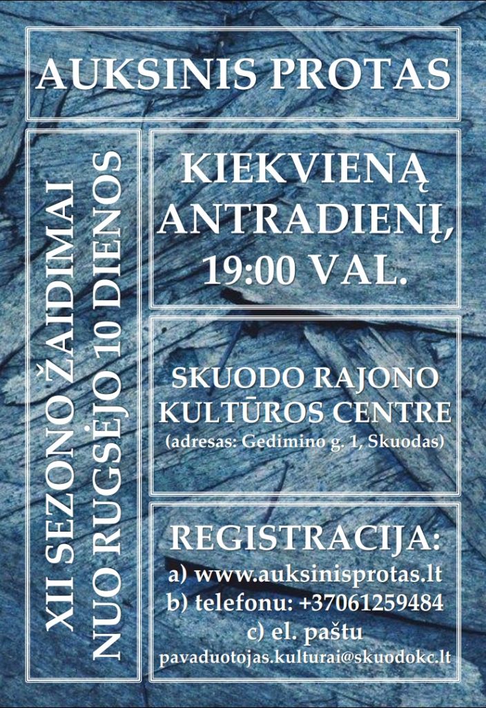 Nuo rugsėjo 10 d. startuoja XII žaidimo „Auksinis protas“ sezonas, kuris tęsis iki gruodžio 3 d. Kovos vyks kiekvieną antradienį 19 val. Skuodo rajono kultūros centre. Jeigu jau esate jose dalyvavę ir norite žaisti toliau, turėtumėte registruotis per savo miesto koordinatorių/vedėją Dalią Ragauskaitę tel. 8 612 59 484; el. p. ). O jei dar niekada nesate dalyvavę, reikėtų užpildyti registracijos anketą https://www.auksinisprotas.lt. Laukiama visų norinčių išbandyti savo jėgas ir turiningai praleisti antradienio vakarus.