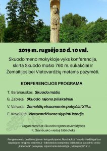 Rugsėjo 20 d. 10 val. Skuodo meno mokykloje – mokslinė konferencija, skirta Skuodo mūšio 760-osioms metinėms bei Žemaitijos ir Vietovardžių metams paminėti. Pranešimai ir pranešėjai: T. Baranauskis „Skuodo mūšis“; G. Zabiela „Skuodo rajono piliakalniai“; V. Vaivada „Žemaičių visuomenės pokyčiai XIII a.“; F. Kavoliūtė „Vietovardžiuose slypinti istorija“.