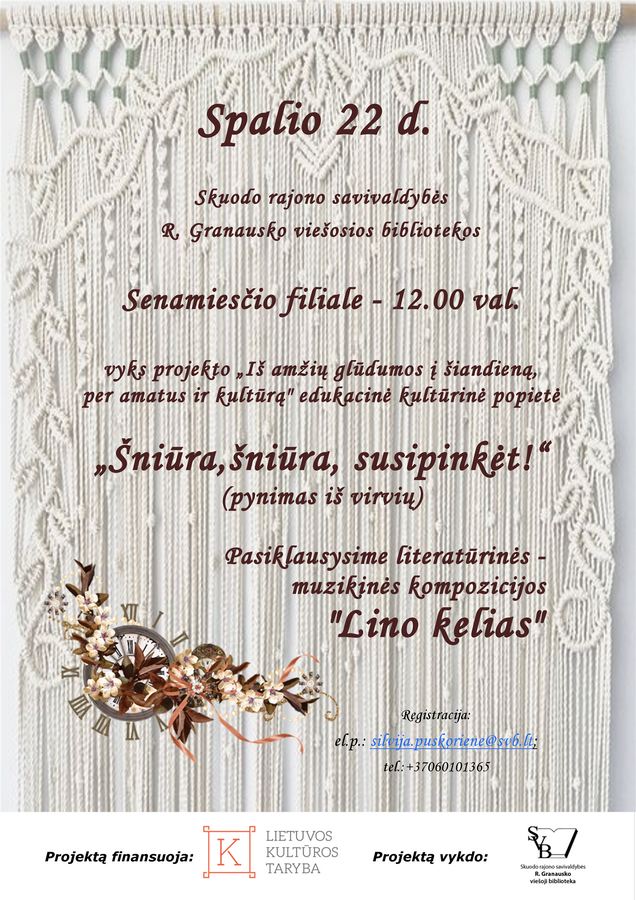 Spalio 22 d. 12 val. Skuodo rajono savivaldybės R. Granausko viešosios bibliotekos Senamiesčio filiale – edukacinė-kultūrinė popietė „Šniūrā, šniūrā, susipinkėt!“ pagal Lietuvos kultūros tarybos finansuojamą Skuodo rajono savivaldybės R. Granausko viešosios bibliotekos kultūros-edukacijos projektą „Iš amžių glūdumos į šiandieną per amatus ir kultūrą“. Popietėje bus parodyta literatūrinė-muzikinė kompozicija „Lino kelias“ ir bus mokoma pinti iš virvių. Norintys mokytis kviečiami registruotis tel. +370 601 01 365 arba el. p. .