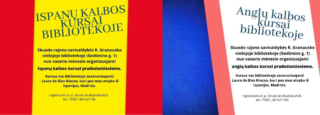 Nuo vasario Skuodo rajono savivaldybės R. Granausko viešojoje bibliotekoje (Gedimino g. 1, Skuodas) organizuojami anglų ir ispanų kalbų kursai pradedantiesiems. Nemokamus kursus ves bibliotekoje savanoriaujanti Laura de Blas Rincon, kuri atvyko iš Ispanijos, Madrido. Norintys mokytis anglų ar ispanų kalbos turėtų registruotis el. p. , tel.: (8 440) 73 301, 8 616 21 106.