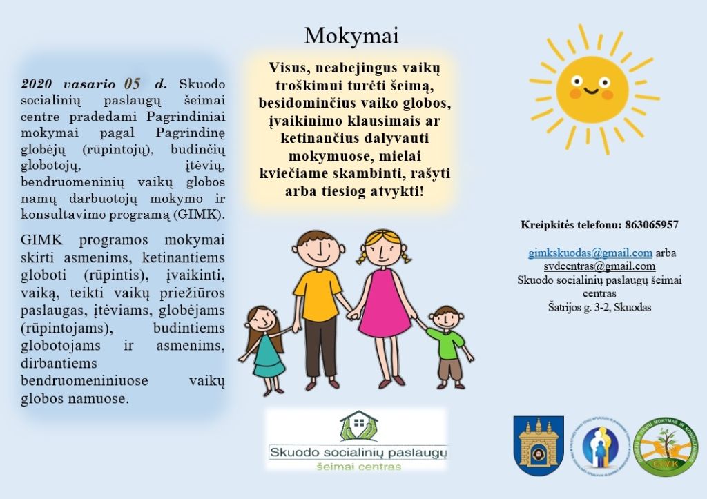 Skuodo socialinių paslaugų šeimai centras kviečia būti neabejingais vaikų troškimui turėti šeimą, atverti savo širdies ir namų duris – padėti jam užaugti saugiai. Visi besidomintys vaiko globos, įvaikinimo klausimais ar ketinantys dalyvauti mokymuose vasario 5 d. kviečiami į Skuodo socialinių paslaugų šeimai centre (Šatrijos g. 3-2) organizuojamus mokymus – GIMK pagal Pagrindinę globėjų (rūpintojų), budinčių globotojų, įtėvių, bendruomeninių vaikų globos namų darbuotojų mokymo ir konsultavimo programą. Išsamesnė informacija tel.: (8 440) 51 021,  8 630 65 957; el. p.: , .