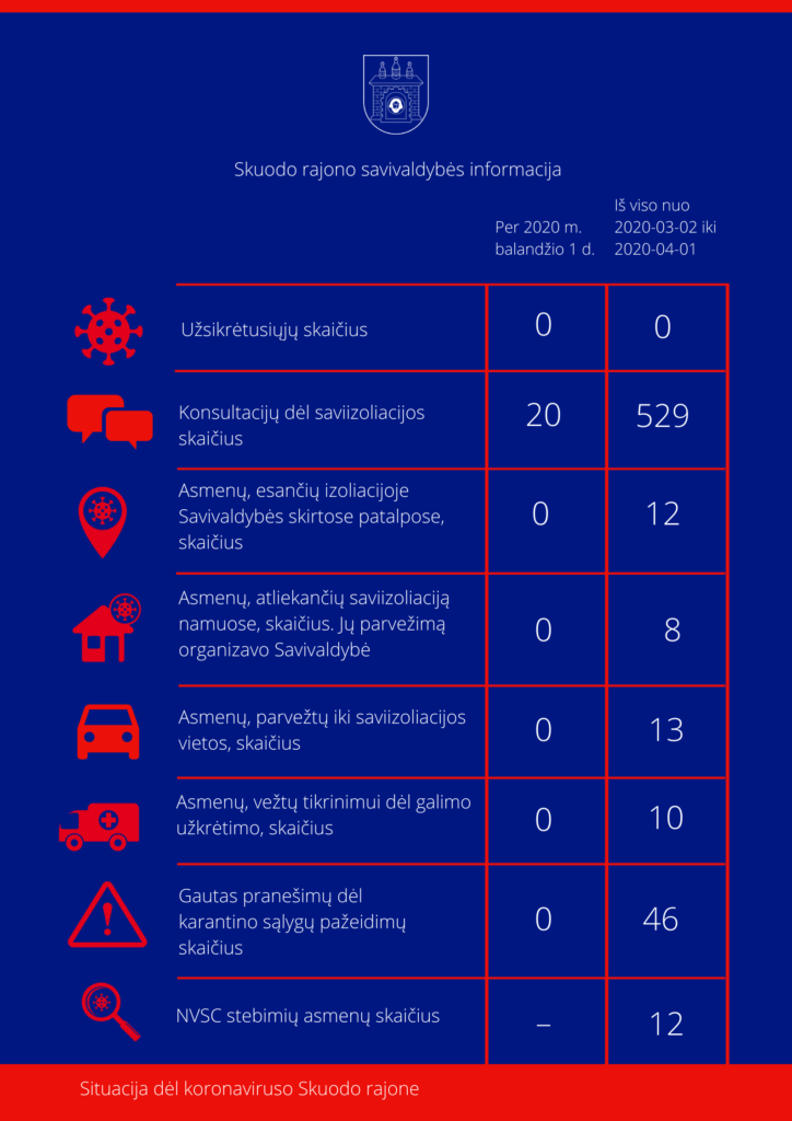 Kaip oficialiai skelbia Skuodo rajono savivaldybė, per kovo mėnesį užsikrėtusių koronavirusu mūsų rajone nenustatyta. Per tą laiką konsultacijų dėl saviizoliacijos į Savivaldybę kreipėsi 529 asmenys. 12 žmonių izoliuota Savivaldybės skirtose patalpose, 8 – namie, bet juos parvežė Savivaldybė. 13 parvežta iki saviizoliacijos vietos. 10 asmenų sukėlė įtarimą, tad vežti tikrinti, ar nėra užsikrėtę koronavirusu. Gauti net 46 pranešimai apie tai, kad pažeidžiami nuo kovo 16 d. šalyje besitęsiančio karantino reikalavimai. Nacionalinis visuomenės sveikatos centras stebėjo 12 asmenų.