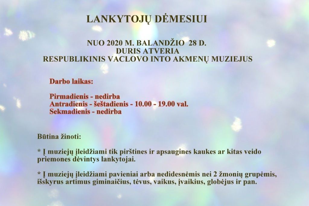 Kaip informavo Respublikinio Vaclovo Into akmenų muziejaus direktorė Gintarė Sakalauskienė, nuo balandžio 28-osios muziejus vėl laukia lankytojų. Pirmadieniais ir sekmadieniais nedirba, o kitomis dienomis – nuo 10 iki 19 val. Į muziejų įleidžiami dėvintys apsaugines veido kaukes, mūvintys pirštines; pavieniui arba po 2 asmenis, išskyrus artimus giminaičius: tėvus, vaikus, įvaikius, globėjus ir pan.