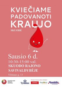 Nacionalinis kraujo centras kviečia nepamiršti kraujo donorystės. Sausio 6 d. (trečiadienį) 10.30–15 val. Skuodo rajono savivaldybėje vyks kraujo donorystės akcija, kurioje bus laikomasi visų saugumo reikalavimų: donorai ir personalas dėvi veido apsaugos priemones, kiekvienam donorui matuojama kūno paviršiaus temperatūra, atvykę donorai turi dezinfekuoti rankas, reguliuojami ateinančiųjų duoti kraujo srautai. Taip pat patalpų ir įrangos paviršiai yra kruopščiai dezinfekuojami. Personalui nuolat atliekami profilaktiniai tyrimai dėl COVID-19 ligos.