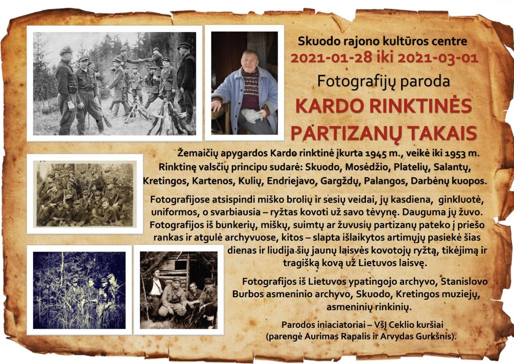Skuodo rajono kultūros centre eksponuojama fotografijų paroda „Kardo rinktinės partizanų takais“. Nuotraukose atsispindi miško brolių ir sesių kasdienybė, ginkluotė, uniformos, o svarbiausia – ryžtas kovoti už savo Tėvynę. Daugelis jų žuvo, tad fotografijos iš bunkerių, miškų, suimtų ar žuvusių partizanų pateko į priešo rankas bei atgulė KGB archyvuose. Slapta artimųjų išsaugotos nuotraukos pasiekė šias dienas ir liudija jaunų laisvės kovotojų ryžtą, tikėjimą bei tragišką kovą už Lietuvos laisvę. Parodą galima pamatyti virtualioje erdvėje.