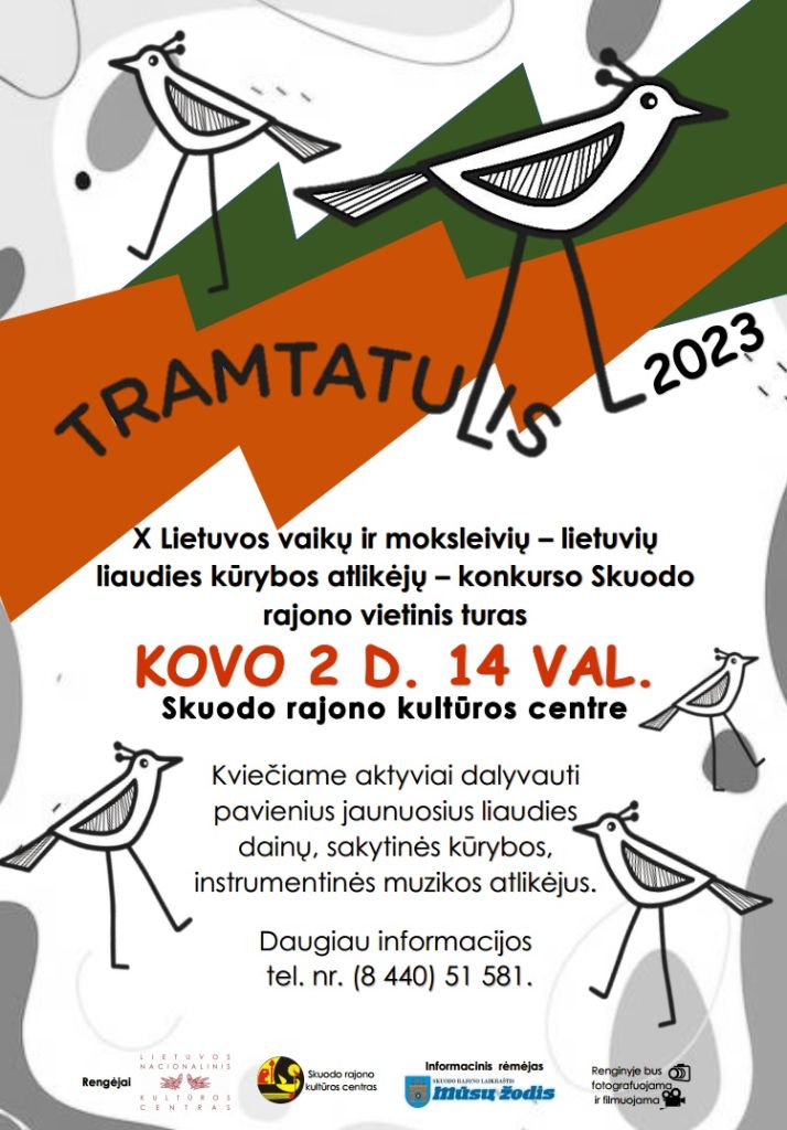 Lietuvos vaikų ir moksleivių – lietuvių liaudies kūrybos atlikėjų – konkursas „Tramtatulis“ vietinis turas Skuode 2023-02-23 | (0) Lietuvos vaikų ir moksleivių – lietuvių liaudies kūrybos atlikėjų – konkursas „Tramtatulis“ vietinis turas Skuode Prenumeruokite „Mūsų žodį“ 2026-iems metams