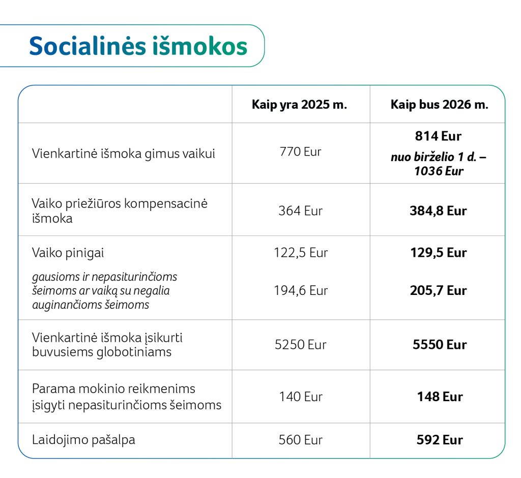 Vienkartinė išmoka gimus vaikui 2026 m. didės nuo 770 eurų iki 814 eurų (o nuo birželio 1 d. – iki 1036 eurų), išmoka vaikui (vaiko pinigai) – iki 129,5 euro.